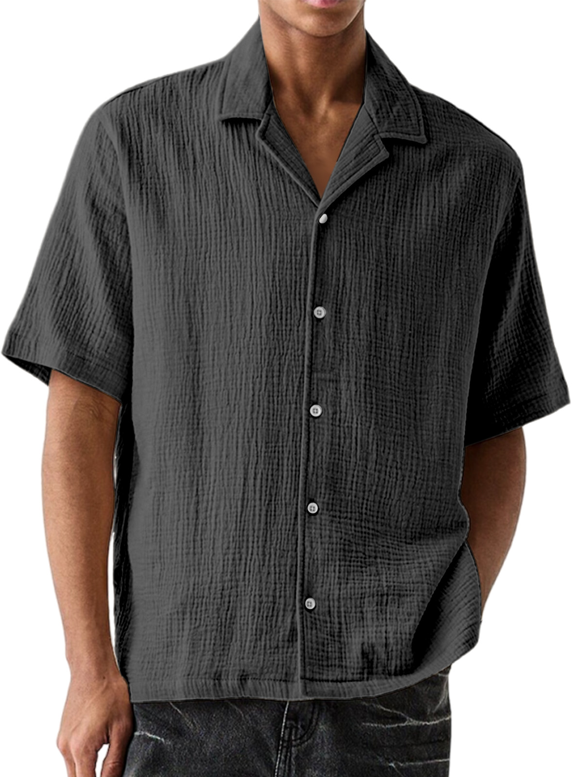 Men's Casual Solid Color Textured Cuban Collar Short-sleeved Shirt