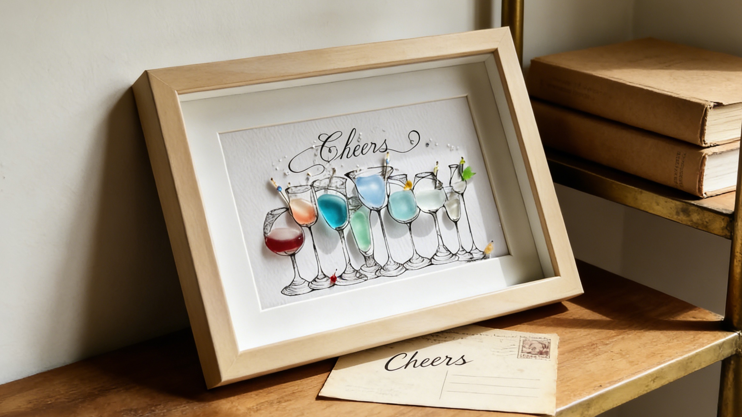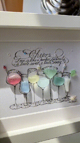 Artistic: Featuring a row of elegant cocktail glasses formed with raised, glossy textures, this piece combines modern artistry with a playful, uplifting spirit. Each glass is filled with a different vibrant hue, creating a lively splash of color that instantly brightens any space.Cup body are painted by the designer himself. The combination of real sea glass and the artist's meticulous craftsmanship creates a visually stunning and immersive experience for any viewer.