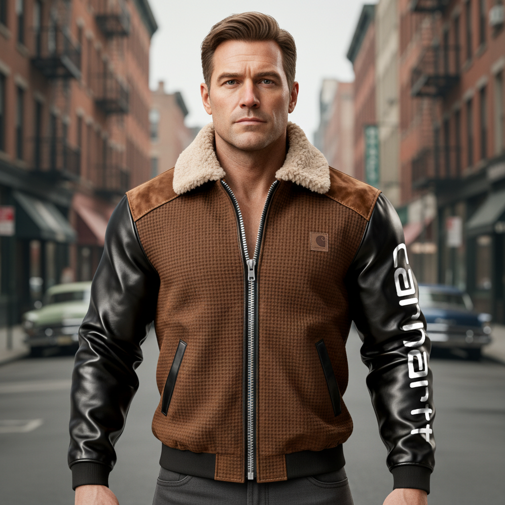 Men's Vintage Brown And Black Bomber Jacket With Sherpa Collar