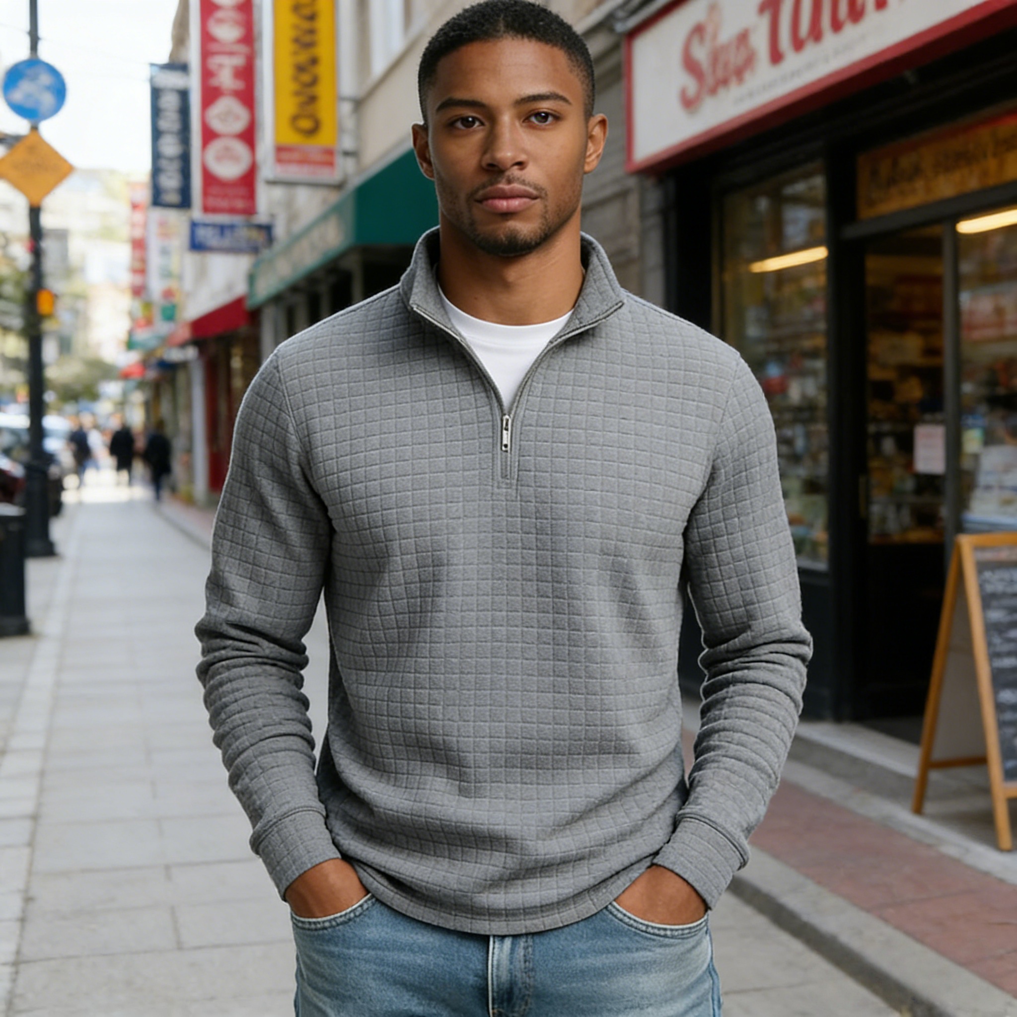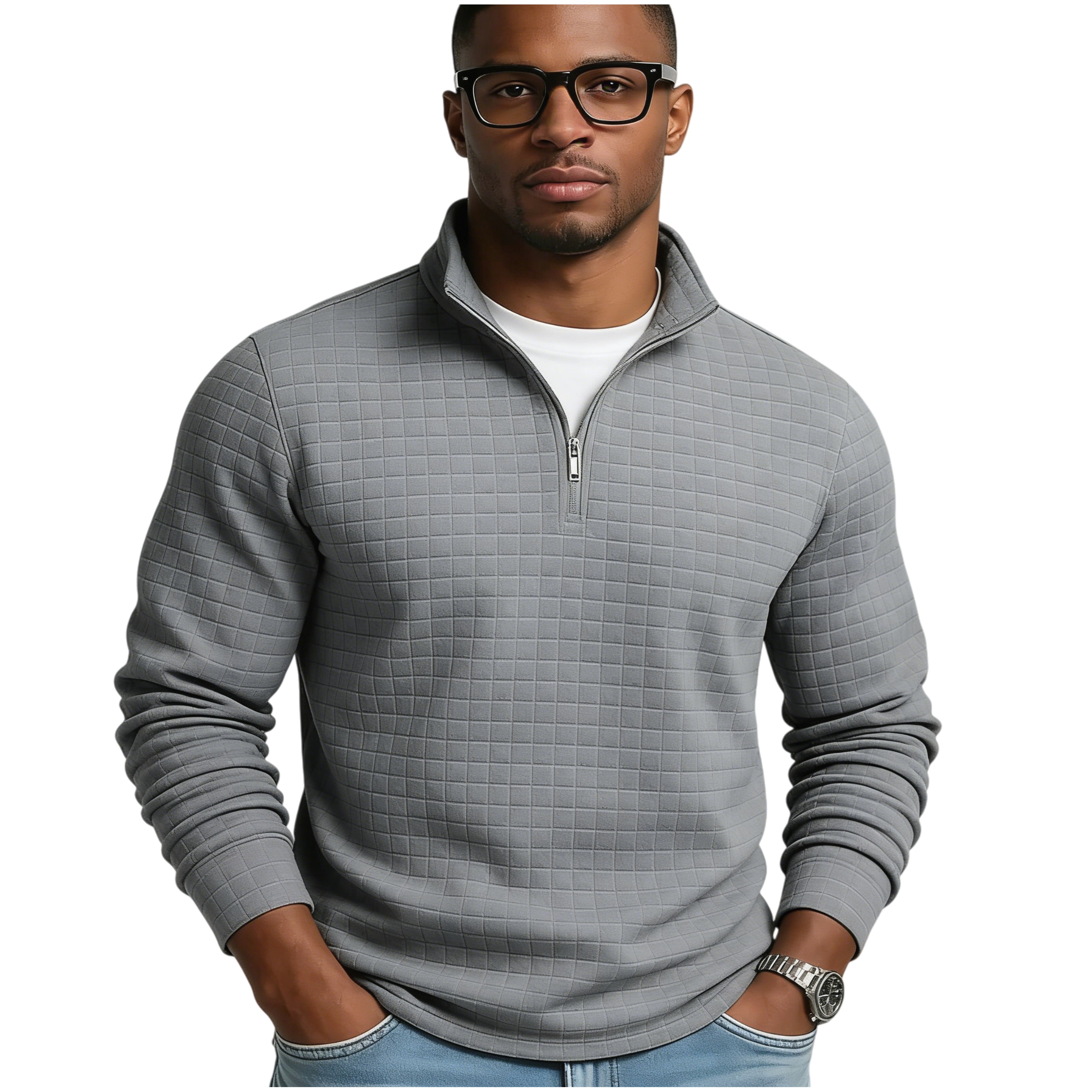 This pullover features a classic quarter-zip neckline and a textured waffle (grid) knit that reads both casual and put-together. The fabric traps warmth while allowing airflow, so you stay comfortable whether you’re running errands, grabbing coffee, or heading into the office on a cool day. Thoughtful details—like reinforced seams, a clean collar finish, and a smooth zipper—give it a refined finish that pairs as well with jeans as it does with chinos.