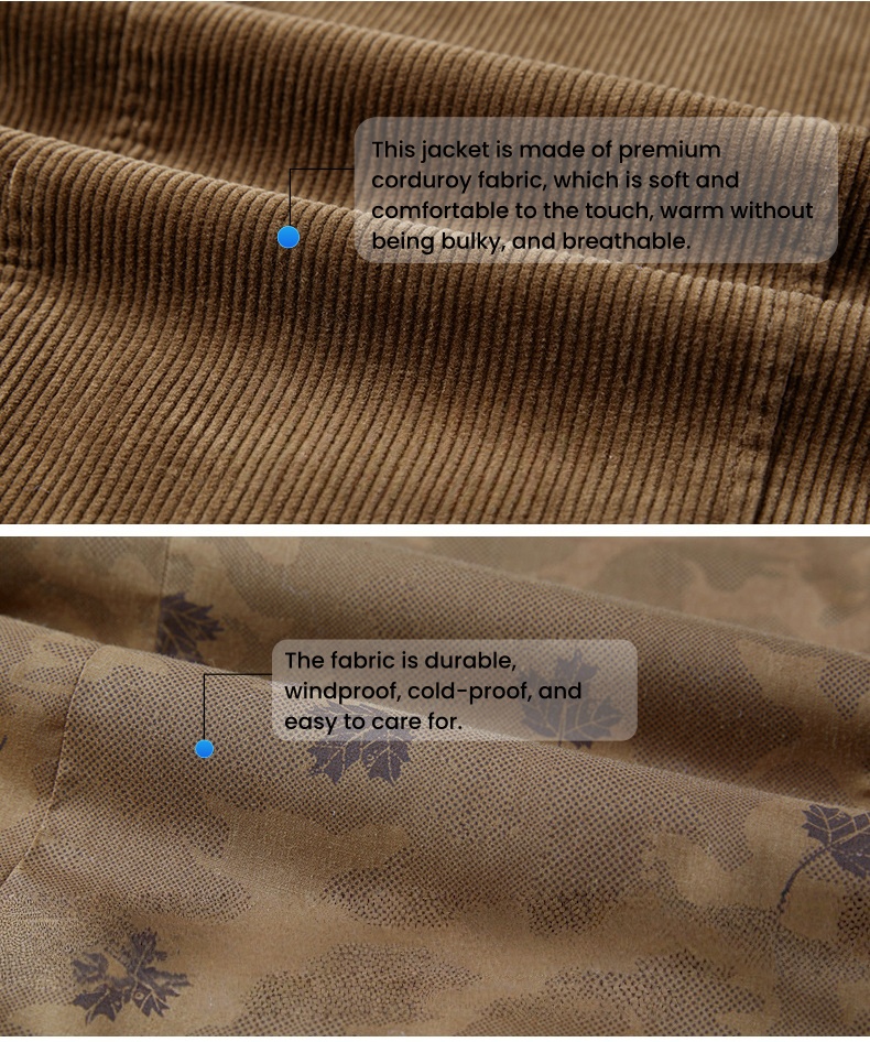 Made from high-quality corduroy, this jacket offers a soft, comfortable feel while providing warmth without being bulky—perfect for cooler weather.